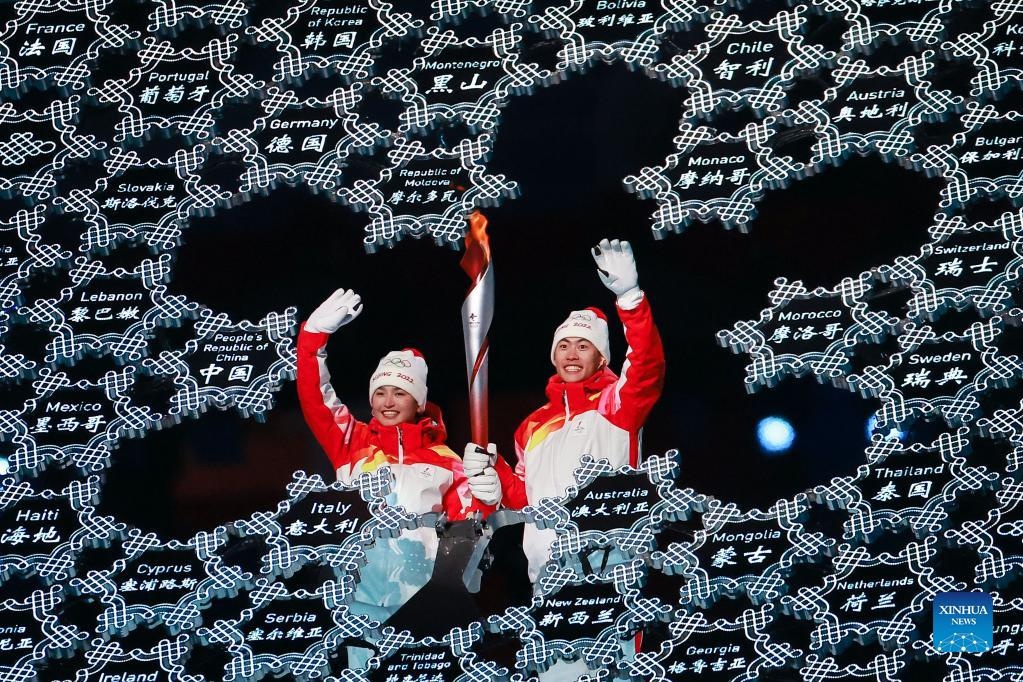 Dinigeer Yilamujiang, a female cross-country skier, and Zhao Jiawen, a male Nordic combined athlete, both born in the 2000s, jointly positioned the Beijing 2022 torch at the heart of a snowflake that was then raised and hung aloft over the Bird's Nest to symbolize the start of the Beijing 2022 Winter Olympic Games on Friday.