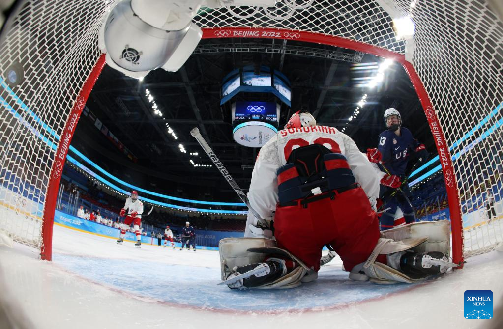 Grace Zumwinkle of the United States scores during the women's ice hockey preliminary round Group A match between the United States and the Russian Olympic Committee at Wukesong Sports Centre in Beijing, capital of China, Feb. 5, 2022. (Xinhua/Song Yanhua)