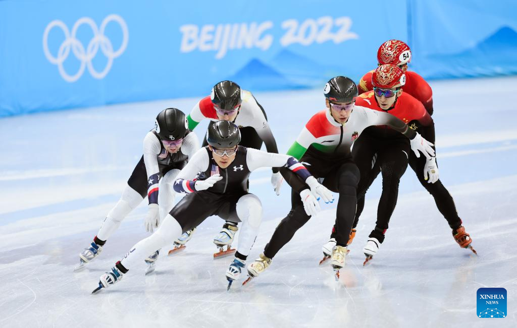 Athletes compete during the mixed team relay semifianl of short track speed skating at Capital Indoor Stadium in Beijing, China, Feb. 5, 2022. (Xinhua/Lan Hongguang)