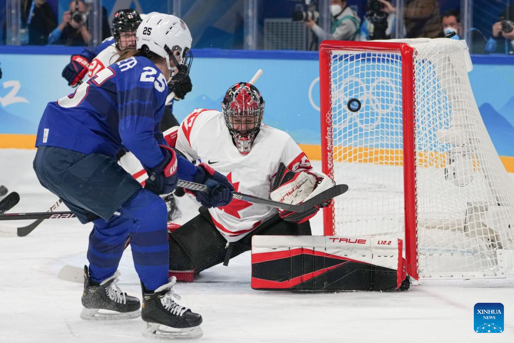 Goalkeeper Ann-Renee Desbiens (C) of Canada makes a save during the ice hockey women's preliminary round group A match between Canada and the United States at Wukesong Sports Centre in Beijing, capital of China, Feb. 8, 2022. (Xinhua/Song Yanhua)