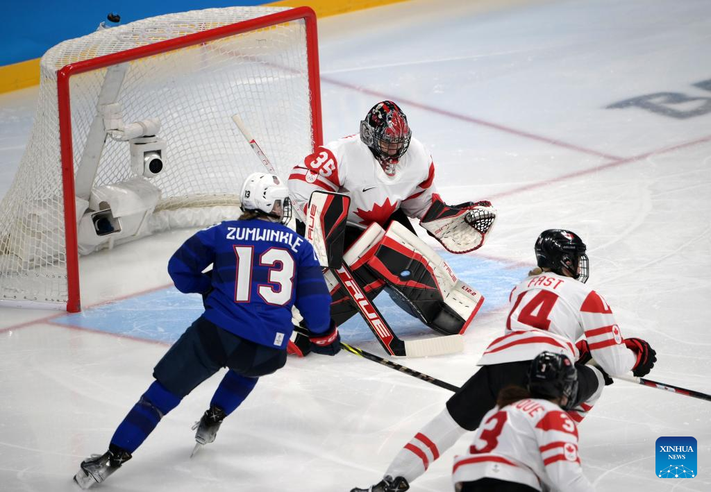Ann-Renee Desbiens (2nd L) of Canada guards the gate during the ice hockey women's preliminary round group A match between Canada and the United States at Wukesong Sports Centre in Beijing, capital of China, Feb. 8, 2022. (Xinhua/Li An)