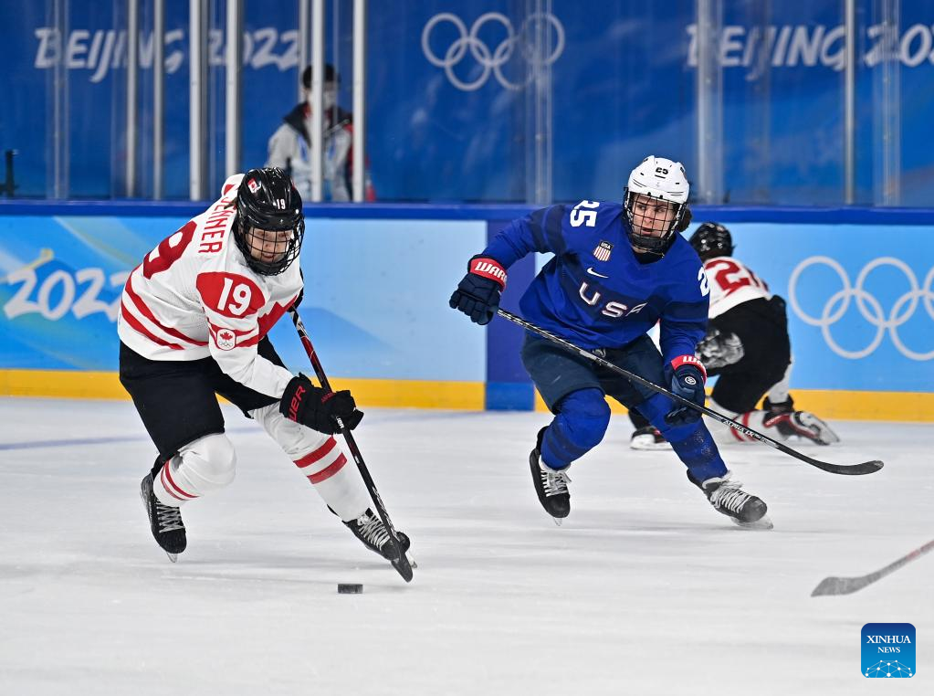 Alex Carpenter (R) of the United States vies with Brianne Jenner of Canada during the ice hockey women's preliminary round group A match between Canada and the United States at Wukesong Sports Centre in Beijing, capital of China, Feb. 8, 2022. (Xinhua/Song Yanhua)