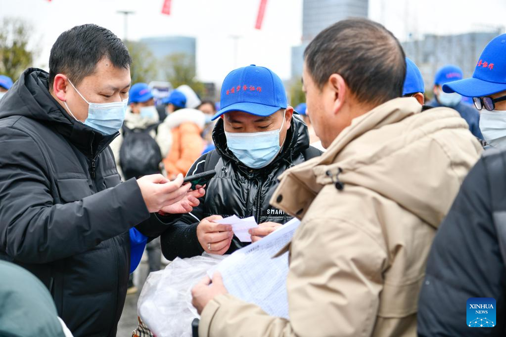 Migrant workers receive security check at Zunyi Station in Zunyi, southwest China's Guizhou Province, Feb. 8, 2022. A special train free of charge for migrant workers who are about to return to work left Zunyi Station in Guizhou Province on Tuesday for Guangzhou and Zhuhai in east China's Guangdong Province. It is the first such train for returning workers in Guizhou this year. More than 600 migrant workers here took the train. (Xinhua/Yang Wenbin)