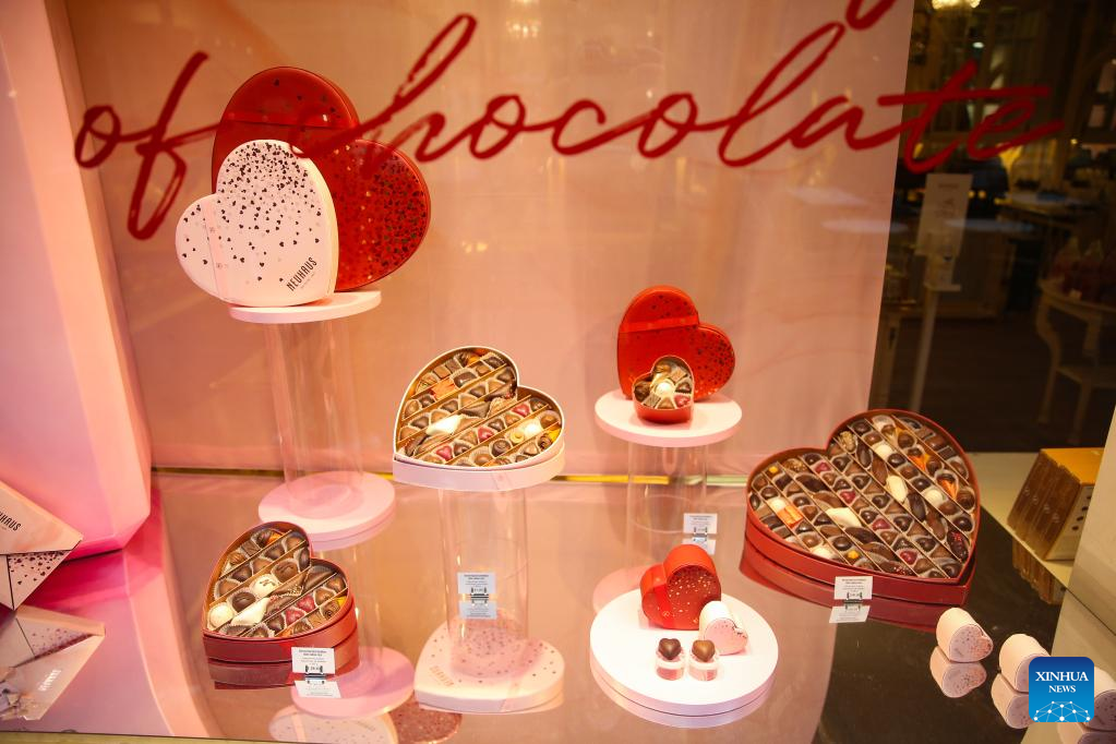 Chocolates in the theme of Valentine's Day are seen at a shop in Brussels, Belgium, Feb. 8, 2022. As the Valentine's Day approaches, new products by Belgian chocolate manufacturers have been put into market to attract shoppers. (Xinhua/Zheng Huansong)