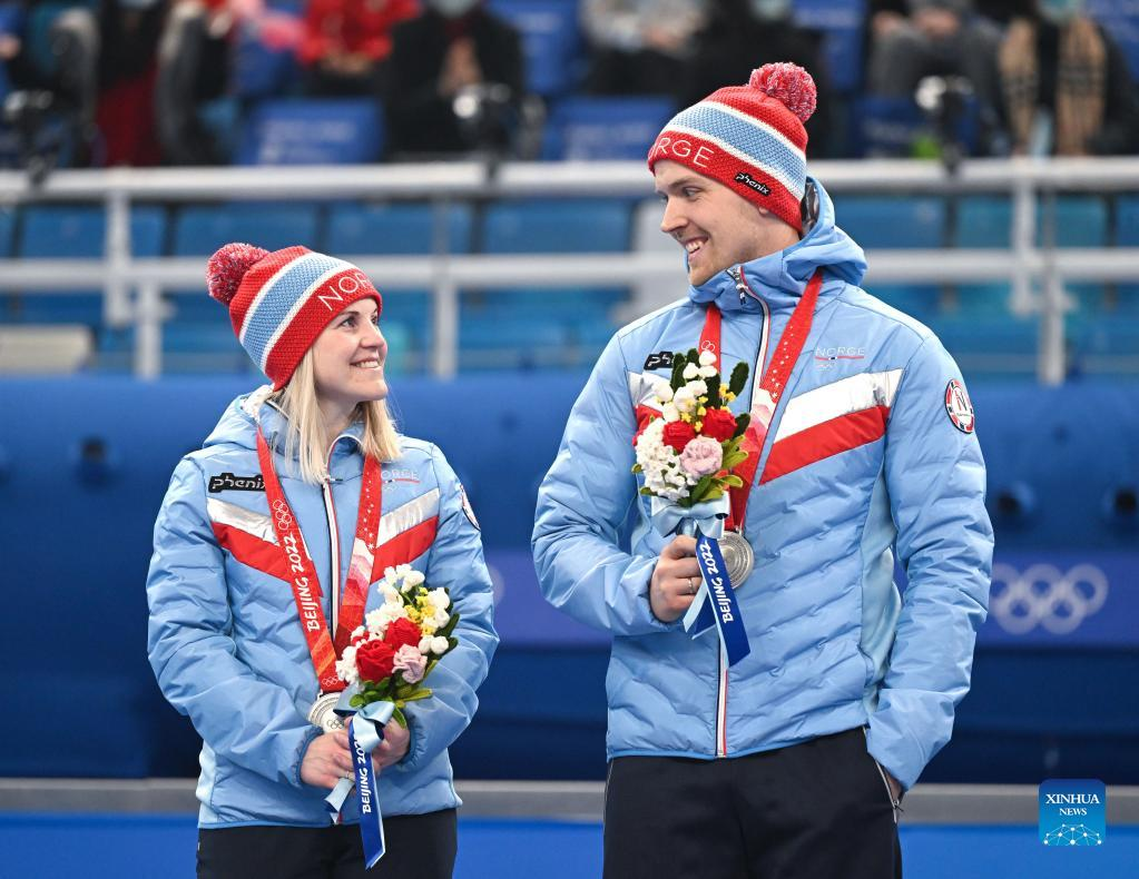 Silver medalists Kristin Skaslien (L) and Magnus Nedregotten of Norway attend the awarding ceremony of the curling mixed doubles event of the Beijing 2022 Winter Olympics at the National Aquatics Centre in Beijing, capital of China, Feb. 8, 2022. (Xinhua/Li He)