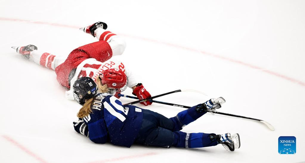 Sofianna Sundelin (front) of Finland competes during the ice hockey women's preliminary round group A match between Finland and ROC at National Indoor Stadium in Beijing, capital of China, Feb. 8, 2022. (Xinhua/Liu Xiao)