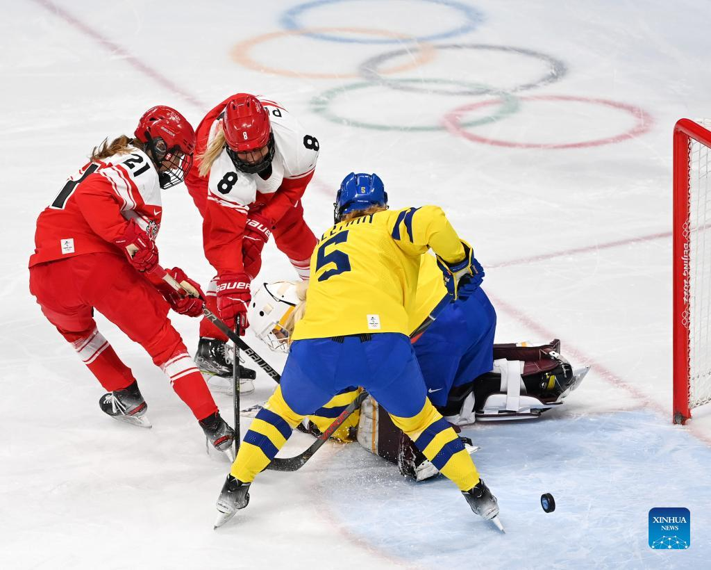 Athletes react during the ice hockey women's preliminary round group B match between Sweden and Denmark at Wukesong Sports Centre in Beijing, capital of China, Feb. 8, 2022. (Xinhua/Li Ran)