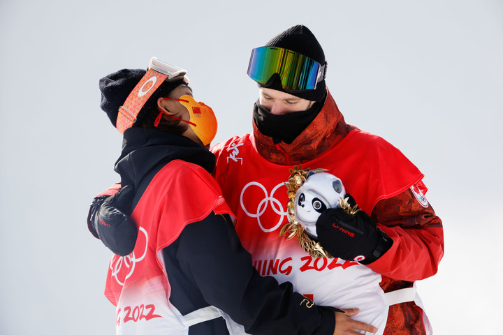 Silver medalist Su Yiming (L) of China and gold medalist Max Parrot (R) of Canada react during the flower ceremony for the Men's Snowboard Slopestyle final at the Genting Snow Park in Zhangjiakou, north China's Hebei Province, Feb. 7, 2022. (Xinhua/Fei Maohua)