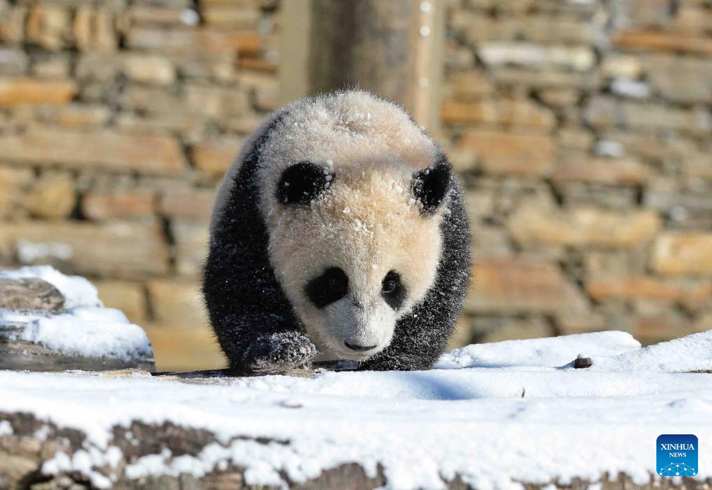 A giant panda is seen at the snow-covered Shenshuping base of the China Conservation and Research Center for Giant Panda in Wolong, southwest China's Sichuan Province, Feb. 9, 2022. (Xinhua/Liu Kun)