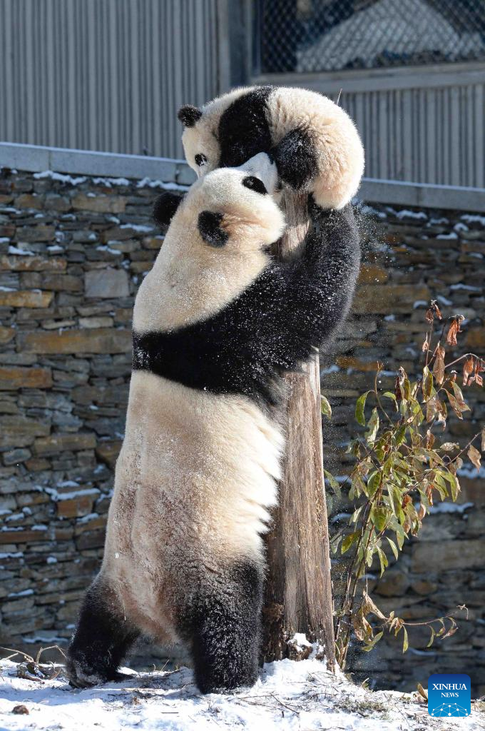 Giant pandas play at the snow-covered Shenshuping base of the China Conservation and Research Center for Giant Panda in Wolong, southwest China's Sichuan Province, Feb. 9, 2022. (Xinhua/Liu Kun)