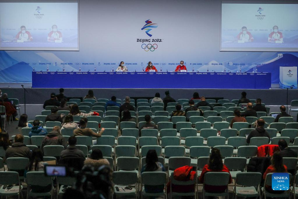 Marie Sallois (C), Director of Corporate and Sustainable Development of International Olympic Committee, attends a regular news conference of the Beijing 2022 Organizing Committee and International Olympic Committee in Beijing, capital of China, Feb. 9, 2022. (Xinhua/Zhang Yuwei)