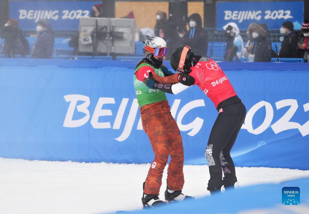 Audrey McManiman of Canada (L) and Stacy Gaskill of the United States react during women's snowboard cross 1/8 finals of the Beijing 2022 Winter Olympics at Genting Snow Park in Zhangjiakou, north China's Hebei Province, Feb. 9, 2022. (Xinhua/Wang Haofei)