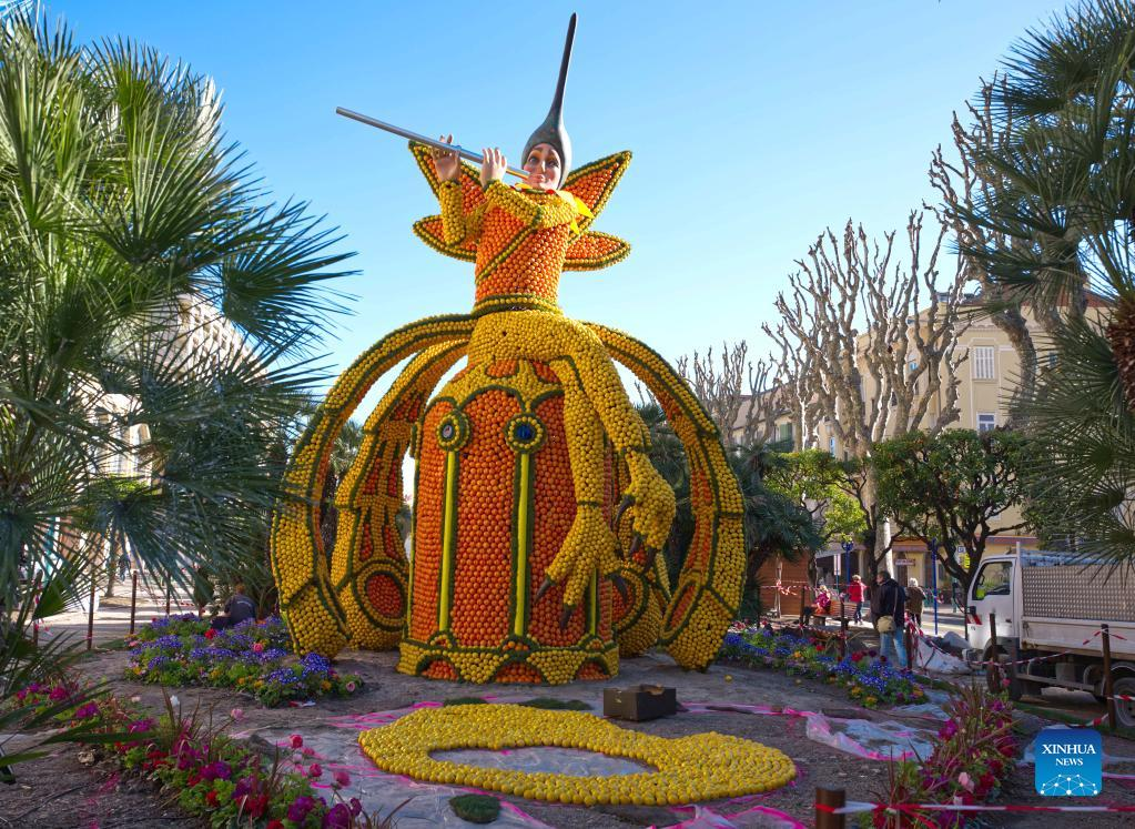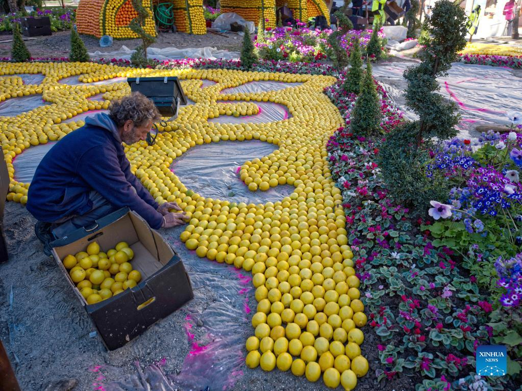 A man decorates an installation during preparations for the annual Lemon Festival in Menton, France, on Feb. 9, 2022. The 2022 Menton Lemon Festival will be held from Feb. 12 to Feb. 27. (Photo by Serge Haouzi/Xinhua)