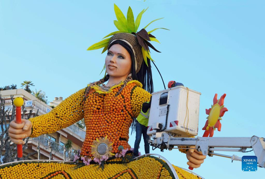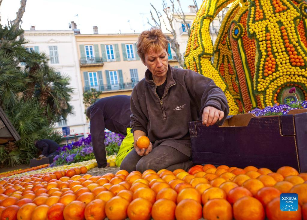 A woman decorates an installation during preparations for the annual Lemon Festival in Menton, France, on Feb. 9, 2022. The 2022 Menton Lemon Festival will be held from Feb. 12 to Feb. 27. (Photo by Serge Haouzi/Xinhua)