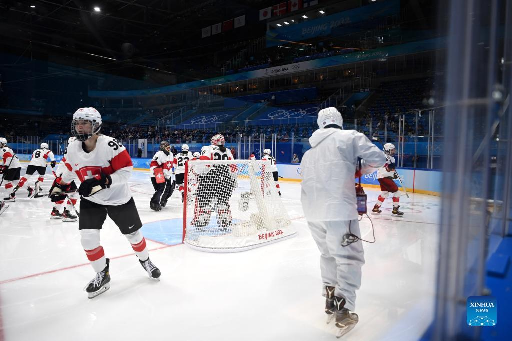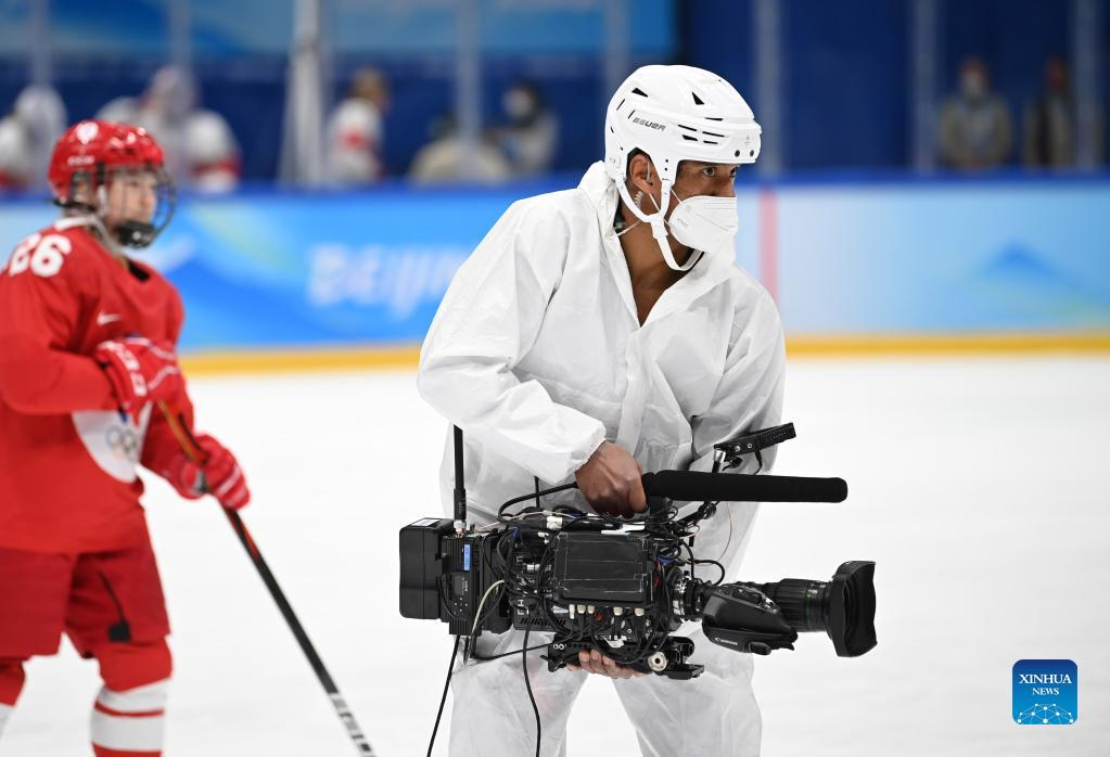 Brennan Mugala in his skates shoots with a video camera on the ice rink at National Indoor Stadium during the Beijing 2022 Olympic Winter Games in Beijing, capital of China, Feb. 8, 2022. The 40-year-old Brennan Mugala from Canada is an infield cameraman of Olympic Broadcasting Services (OBS) covering ice hockey events at National Indoor Stadium in Beijing. Unlike all the other cameramen and photographers in the stadium, Mugala needs to work in a pair of skates as he needs to enter the ice rink for infield shooting before and after the game, so as to bring up-close images of the athletes to the TV audience. In his ten years of work, Mugala has served the Olympic Games for three times. This year's Winter Olympics, however, is the busiest among his Olympic working experiences. In the Beijing 2022 Winter Olympics, he is responsible for controlling both the hand-held camera and the wireless camera. Mugala also needs to cooperate with his colleagues at all times to ensure the smooth broadcasting of each game. Speaking of the facilities and services of the Beijing 2022 Winter Olympics, Mugala said everything provided by the Beijing 2022 Winter Olympics is meticulous and professional. "China has done a great job in the preparatory work, which also sets a good example for other countries in holding large-scale sports event amid the epidemic." This is Mugala's first time to China. "I like Chinese food as well as the Chinese culture very much," said Mugala. "Although I don't have the opportunity to learn more about China under the closed-loop management, I can feel the warmth and friendliness of the Chinese people." When the pandemic is over, "I will definitely bring my family back to Beijing to revisit this familiar yet still-more-to-explore city," said Mugala. (Xinhua/Li Ziheng)