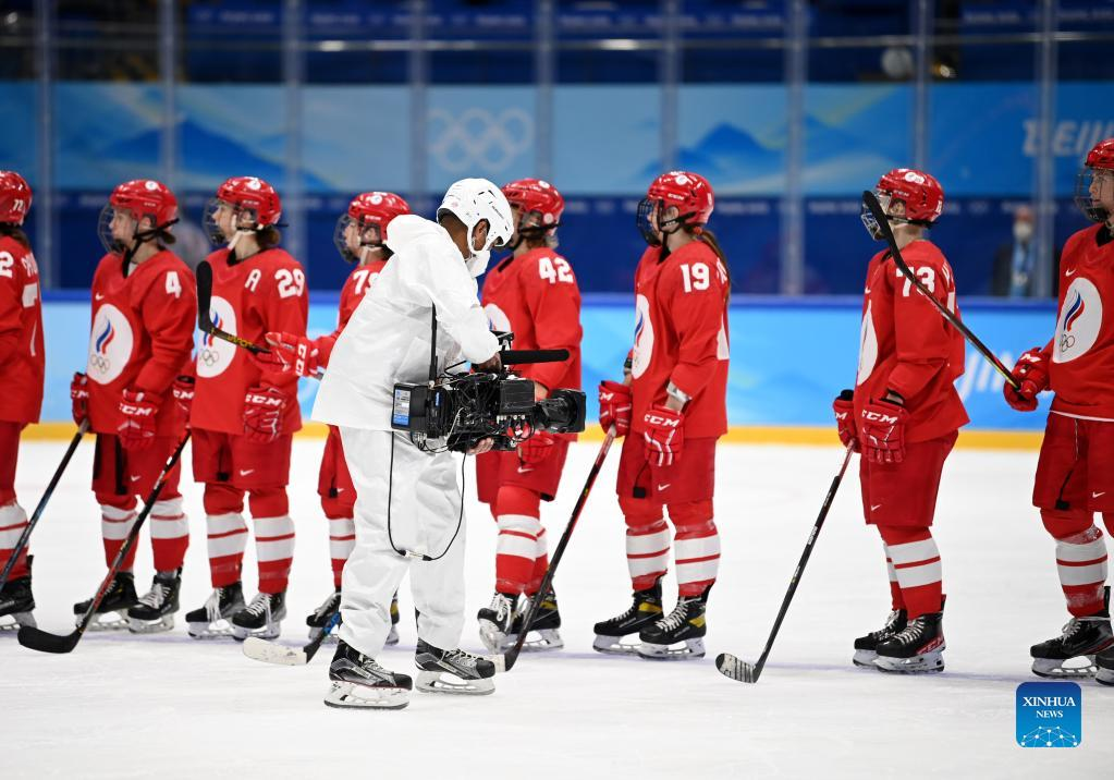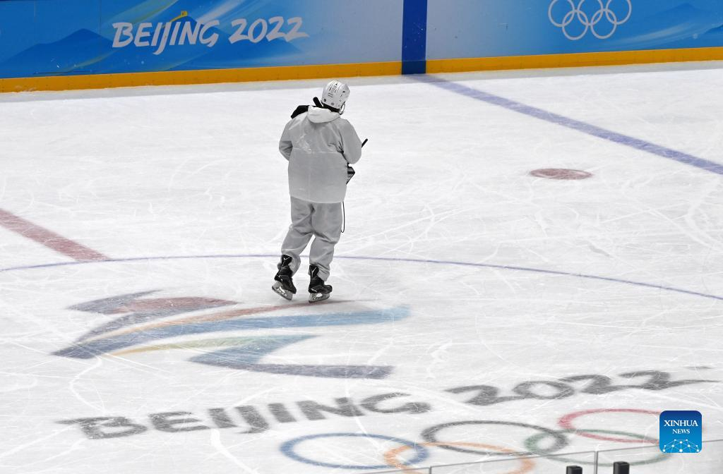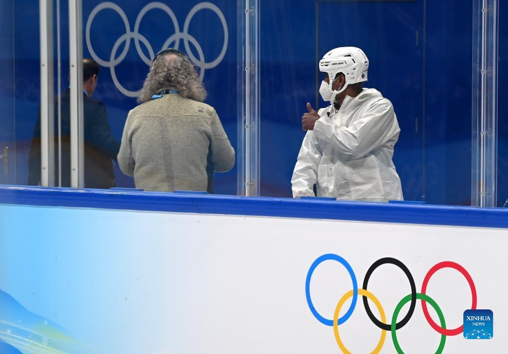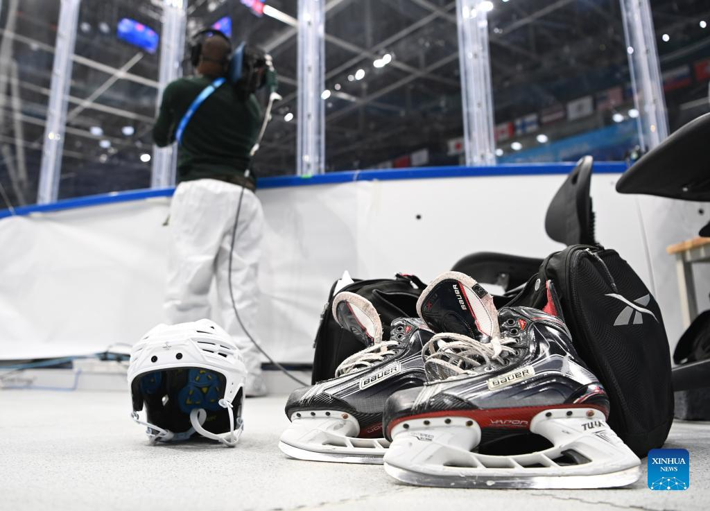 Brennan Mugala gets himself ready for infield shooting on the ice rink at National Indoor Stadium during the Beijing 2022 Olympic Winter Games in Beijing, capital of China, Feb. 8, 2022. The 40-year-old Brennan Mugala from Canada is an infield cameraman of Olympic Broadcasting Services (OBS) covering ice hockey events at National Indoor Stadium in Beijing. Unlike all the other cameramen and photographers in the stadium, Mugala needs to work in a pair of skates as he needs to enter the ice rink for infield shooting before and after the game, so as to bring up-close images of the athletes to the TV audience. In his ten years of work, Mugala has served the Olympic Games for three times. This year's Winter Olympics, however, is the busiest among his Olympic working experiences. In the Beijing 2022 Winter Olympics, he is responsible for controlling both the hand-held camera and the wireless camera. Mugala also needs to cooperate with his colleagues at all times to ensure the smooth broadcasting of each game. Speaking of the facilities and services of the Beijing 2022 Winter Olympics, Mugala said everything provided by the Beijing 2022 Winter Olympics is meticulous and professional. "China has done a great job in the preparatory work, which also sets a good example for other countries in holding large-scale sports event amid the epidemic." This is Mugala's first time to China. "I like Chinese food as well as the Chinese culture very much," said Mugala. "Although I don't have the opportunity to learn more about China under the closed-loop management, I can feel the warmth and friendliness of the Chinese people." When the pandemic is over, "I will definitely bring my family back to Beijing to revisit this familiar yet still-more-to-explore city," said Mugala. (Xinhua/Li Ziheng)
