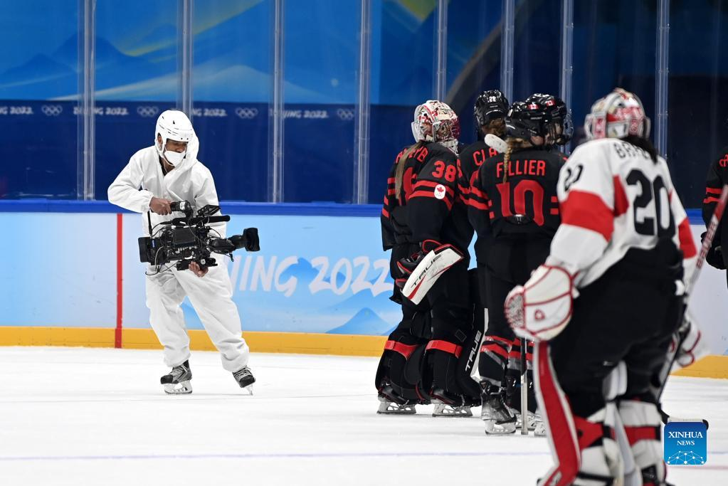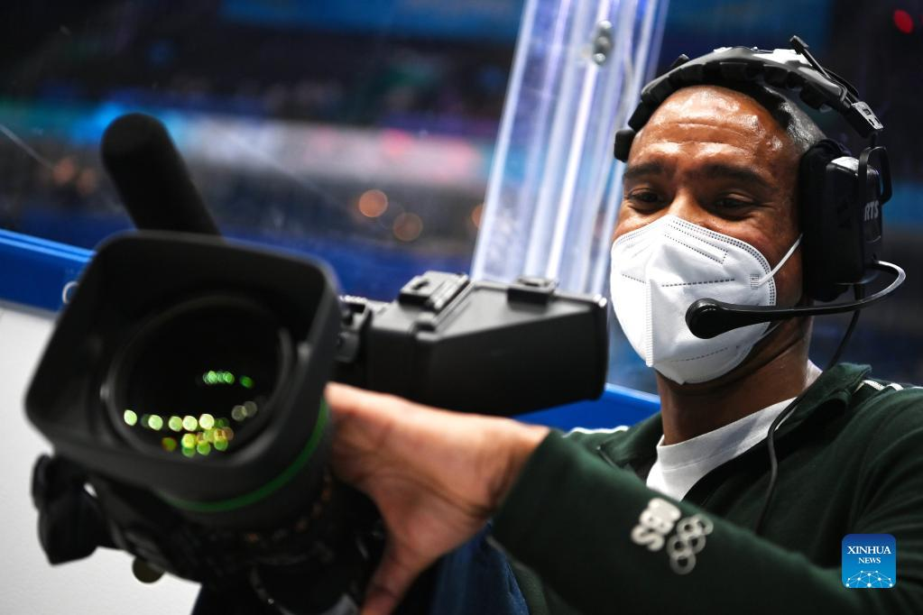 Brennan Mugala shoots with a video camera in his skates on the ice rink at National Indoor Stadium during the Beijing 2022 Olympic Winter Games in Beijing, capital of China, Feb. 8, 2022. The 40-year-old Brennan Mugala from Canada is an infield cameraman of Olympic Broadcasting Services (OBS) covering ice hockey events at National Indoor Stadium in Beijing. Unlike all the other cameramen and photographers in the stadium, Mugala needs to work in a pair of skates as he needs to enter the ice rink for infield shooting before and after the game, so as to bring up-close images of the athletes to the TV audience. In his ten years of work, Mugala has served the Olympic Games for three times. This year's Winter Olympics, however, is the busiest among his Olympic working experiences. In the Beijing 2022 Winter Olympics, he is responsible for controlling both the hand-held camera and the wireless camera. Mugala also needs to cooperate with his colleagues at all times to ensure the smooth broadcasting of each game. Speaking of the facilities and services of the Beijing 2022 Winter Olympics, Mugala said everything provided by the Beijing 2022 Winter Olympics is meticulous and professional. "China has done a great job in the preparatory work, which also sets a good example for other countries in holding large-scale sports event amid the epidemic." This is Mugala's first time to China. "I like Chinese food as well as the Chinese culture very much," said Mugala. "Although I don't have the opportunity to learn more about China under the closed-loop management, I can feel the warmth and friendliness of the Chinese people." When the pandemic is over, "I will definitely bring my family back to Beijing to revisit this familiar yet still-more-to-explore city," said Mugala. (Xinhua/Li Ziheng)