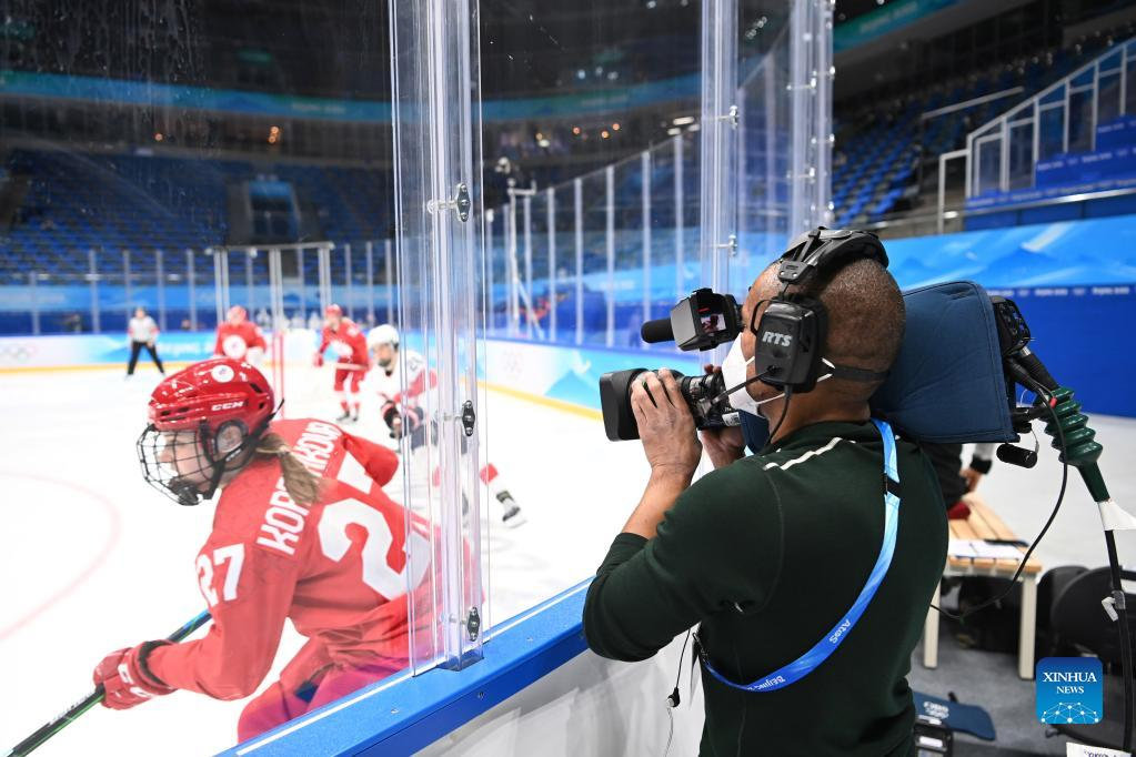Brennan Mugala waits to enter the ice rink for infield shooting at National Indoor Stadium during the Beijing 2022 Olympic Winter Games in Beijing, capital of China, Feb. 8, 2022. The 40-year-old Brennan Mugala from Canada is an infield cameraman of Olympic Broadcasting Services (OBS) covering ice hockey events at National Indoor Stadium in Beijing. Unlike all the other cameramen and photographers in the stadium, Mugala needs to work in a pair of skates as he needs to enter the ice rink for infield shooting before and after the game, so as to bring up-close images of the athletes to the TV audience. In his ten years of work, Mugala has served the Olympic Games for three times. This year's Winter Olympics, however, is the busiest among his Olympic working experiences. In the Beijing 2022 Winter Olympics, he is responsible for controlling both the hand-held camera and the wireless camera. Mugala also needs to cooperate with his colleagues at all times to ensure the smooth broadcasting of each game. Speaking of the facilities and services of the Beijing 2022 Winter Olympics, Mugala said everything provided by the Beijing 2022 Winter Olympics is meticulous and professional. "China has done a great job in the preparatory work, which also sets a good example for other countries in holding large-scale sports event amid the epidemic." This is Mugala's first time to China. "I like Chinese food as well as the Chinese culture very much," said Mugala. "Although I don't have the opportunity to learn more about China under the closed-loop management, I can feel the warmth and friendliness of the Chinese people." When the pandemic is over, "I will definitely bring my family back to Beijing to revisit this familiar yet still-more-to-explore city," said Mugala. (Xinhua/Li Ziheng)