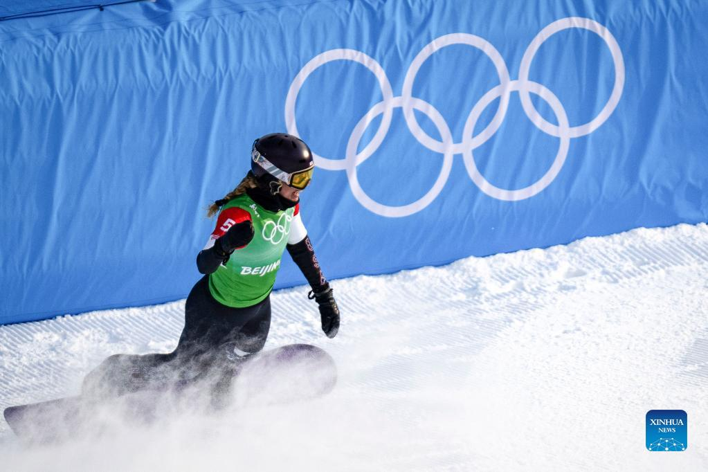 Gold medallist Lindsey Jacobellis (front) of the United States competes during women's snowboard cross 1/4 finals of the Beijing 2022 Winter Olympics at Genting Snow Park in Zhangjiakou, north China's Hebei Province, Feb. 9, 2022.