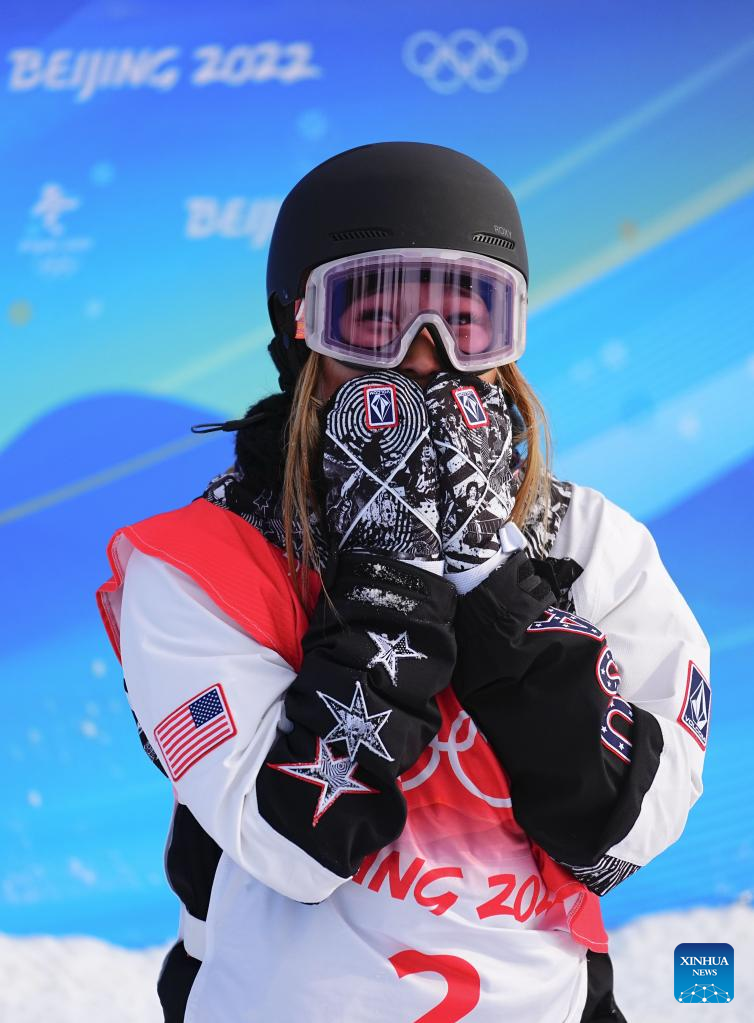Chloe Kim of the United States reacts during the women's snowboard halfpipe final at Genting Snow Park in Zhangjiakou, north China's Hebei Province, Feb. 10, 2022. (Xinhua/Xu Chang)
