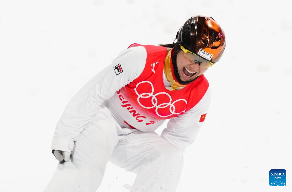Xu Mengtao of China reacts after the freestyle skiing mixed team aerials final at Genting Snow Park in Zhangjiakou, north China's Hebei Province, Feb. 10, 2022. (Xinhua/Xue Yubin)