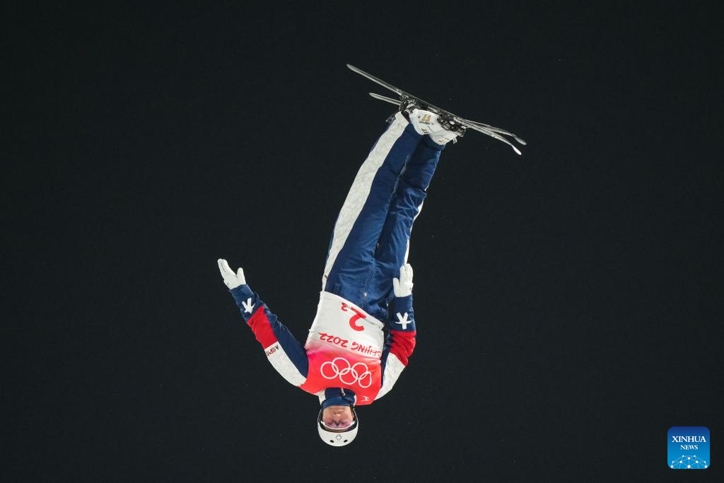Justin Schoenefeld of the United States competes during the freestyle skiing mixed team aerials final at Genting Snow Park in Zhangjiakou, north China's Hebei Province, Feb. 10, 2022. (Xinhua/Xue Yubin)
