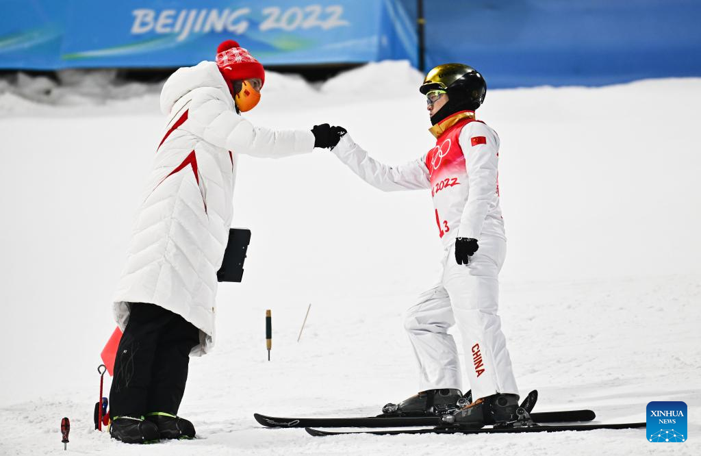 Qi Guangpu (R) of China reacts during the freestyle skiing mixed team aerials final at Genting Snow Park in Zhangjiakou, north China's Hebei Province, Feb. 10, 2022. (Xinhua/Zhu Zheng)