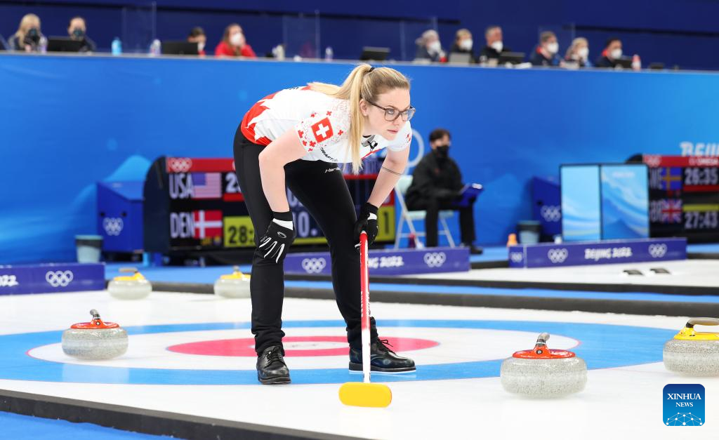 Alina Paetz of Switzerland competes during the Curling Women's Round Robin Session 2 of the Beijing 2022 Winter Olympics between China and Switzerland at the National Aquatics Centre in Beijing, capital of China, Feb. 10, 2022. (Xinhua/Lan Hongguang)