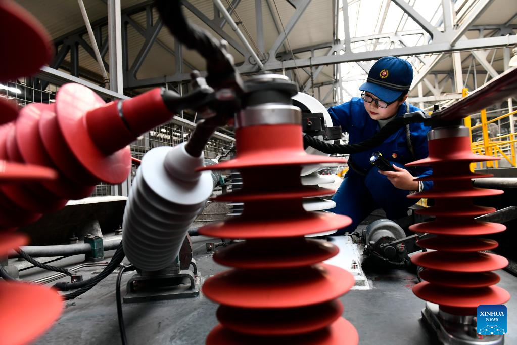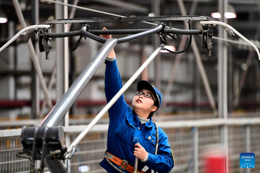 Yang Jingxian, a bullet train mechanist, checks a train at Jinan bullet train service station in Jinan, east China's Shandong Province, Feb. 10, 2022. There is a maintenance team composed of five post-98s women at Jinan bullet train service station. Not long after starting their work in October last year, these young mechanists witnessed their first Spring Festival travel rush.