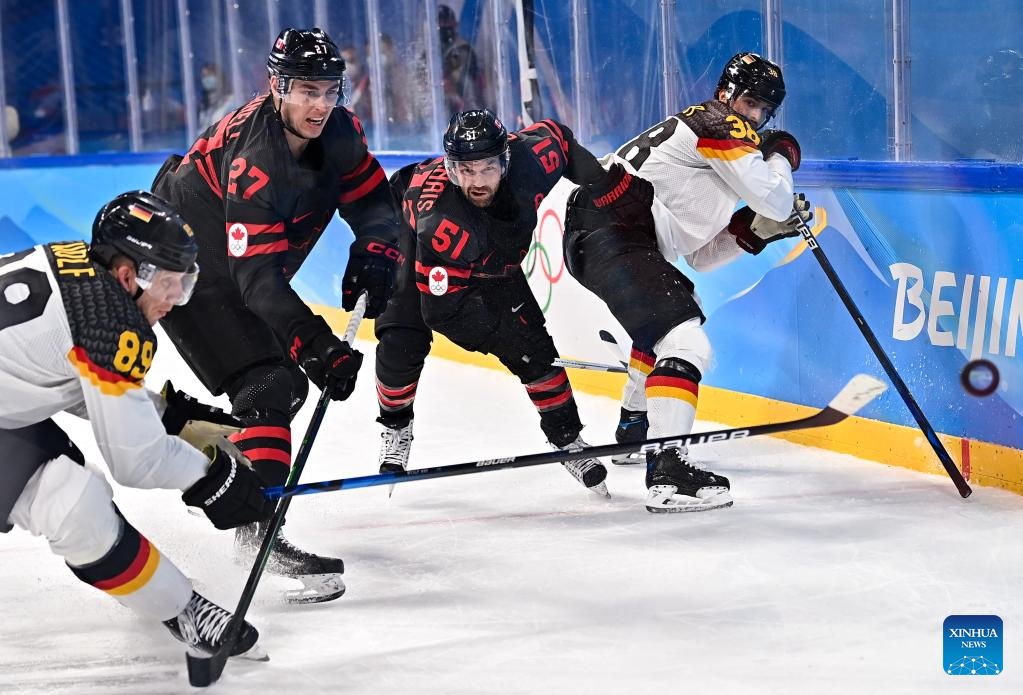 David Desharnais (2nd R) and Adam Cracknell (2nd L) of Canada compete during ice hockey men's Group A match between Canada and Germany at Wukesong Sports Centre in Beijing, capital of China, Feb. 10, 2022. (Xinhua/Song Yanhua)