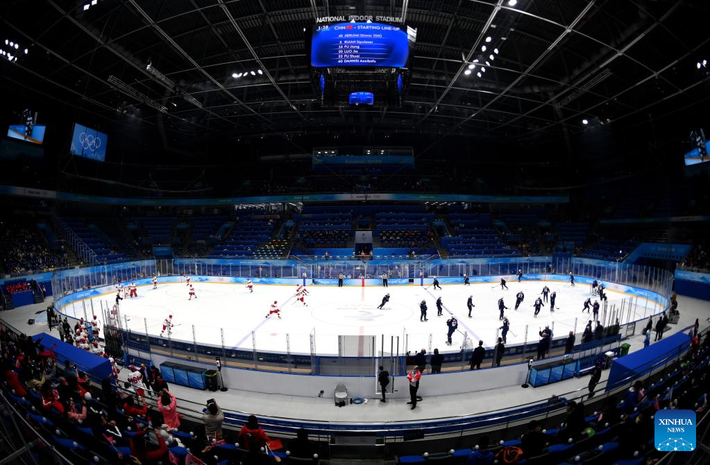 Athletes prepare to compete before ice hockey men's Group A match between Canada and Germany at Wukesong Sports Centre in Beijing, capital of China, Feb. 10, 2022. (Xinhua/Liu Xiao)