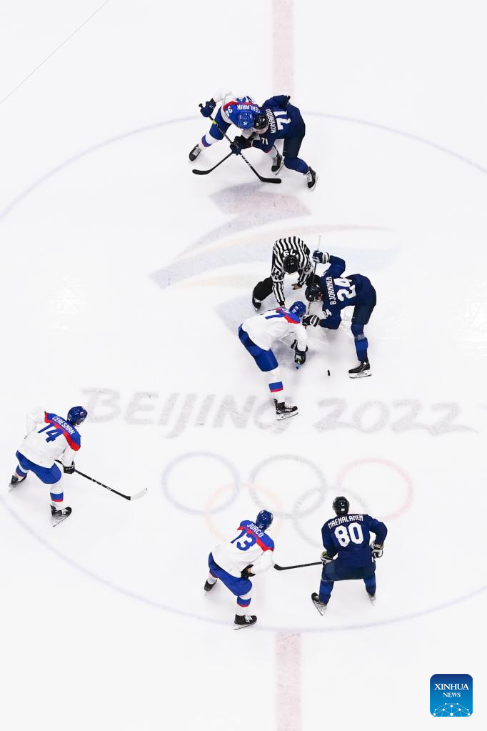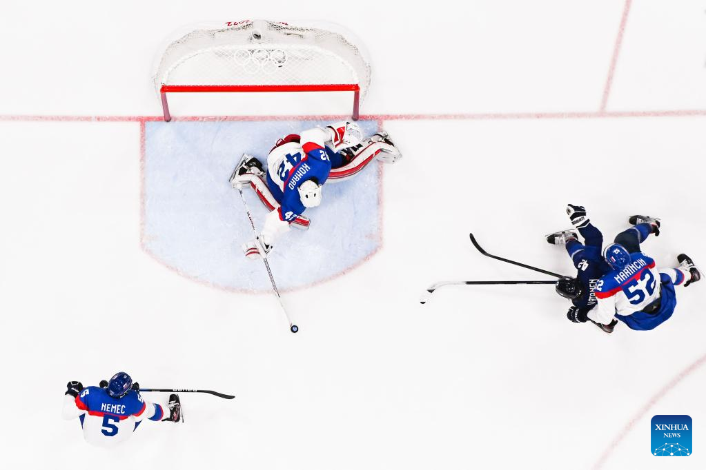 Branislav Konrad (top) of Slovakia competes during the ice hockey men's Group C match between Finland and Slovakia at National Indoor Stadium in Beijing, capital of China, Feb. 10, 2022. (Xinhua/Xue Yuge)
