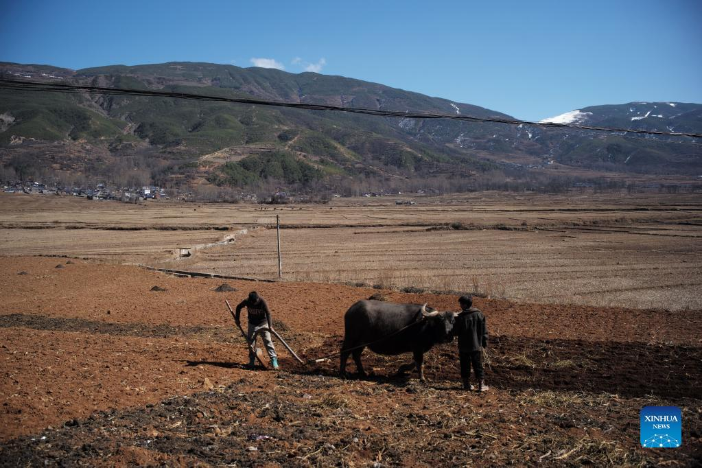Farmers plough the field at Zhaojue County in Liangshan Yi Autonomous Prefecture, southwest China's Sichuan Province, Feb. 9, 2022. (Photo by Chen Dakang/Xinhua)