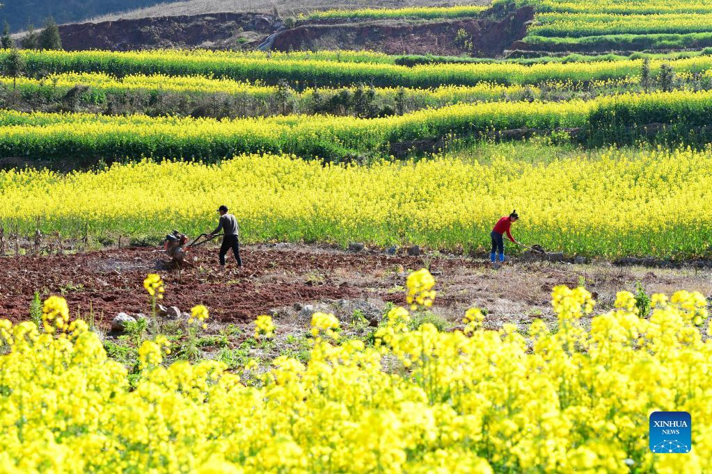 Farmers work in a field in Luoping County of Qujing City, southwest China's Yunnan province, Feb. 11, 2022. (Photo by Mao Hong/Xinhua)