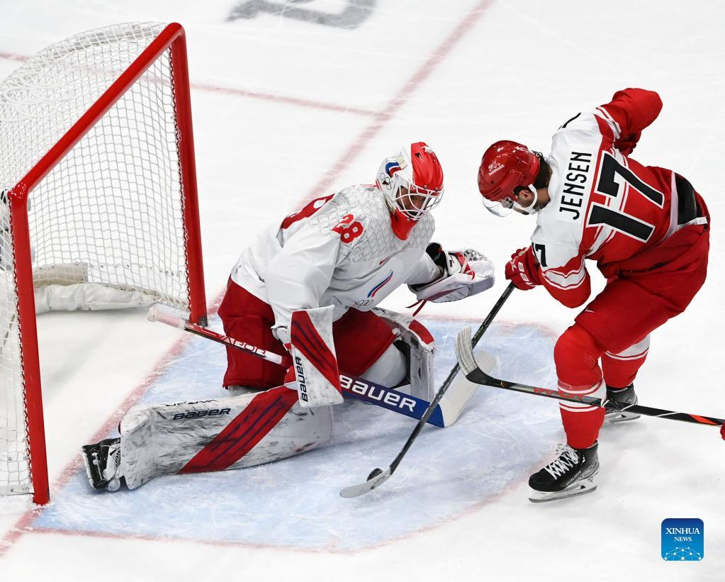 Nicklas Jensen (R) of Denmark shoots during the men's ice hockey preliminary round Group B match between Denmark and ROC at the National Indoor Stadium in Beijing, China, Feb. 11, 2022. (Xinhua/Li He)