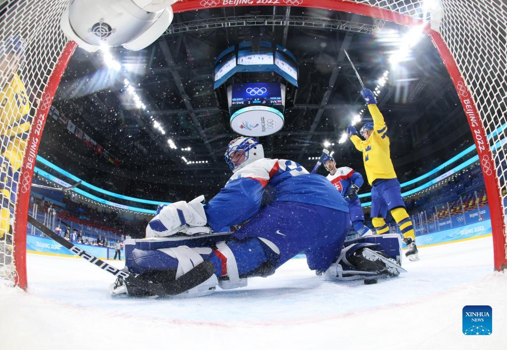 Joakim Nordstrom (C) of Sweden celebrates scoring during the ice hockey men's preliminary round Group C match between Sweden and Slovakia at Wukesong Sports Centre in Beijing, capital of China, Feb. 11, 2022. (Xinhua/Huang Zongzhi)