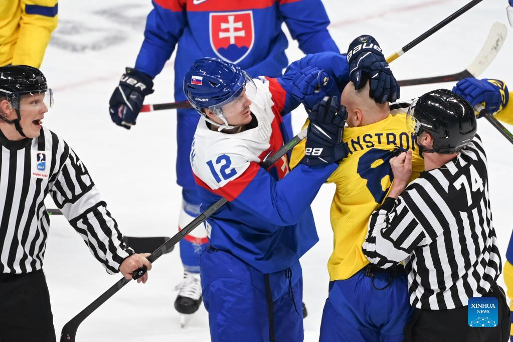 Theodor Lennstrom (C) of Sweden and Milos Kelemen (R) of Slovakia clash during the ice hockey men's preliminary round Group C match between Sweden and Slovakia at Wukesong Sports Centre in Beijing, capital of China, Feb. 11, 2022. (Xinhua/Huang Zongzhi)