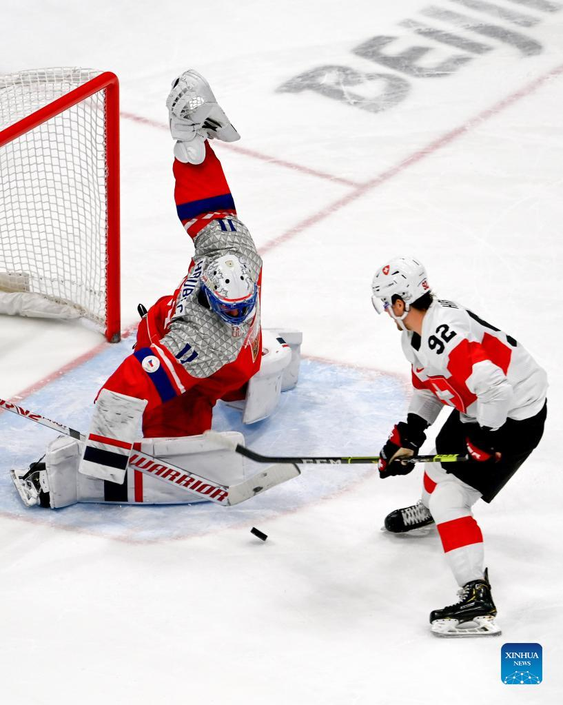 David Krejci (L) of the Czech Republic scores his penalty during the ice hockey men's preliminary round Group B match between the Czech Republic and Switzerland at National Indoor Stadium in Beijing, capital of China, Feb. 11, 2022. (Xinhua/Liu Xiao)