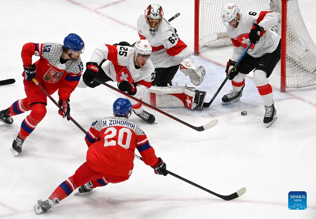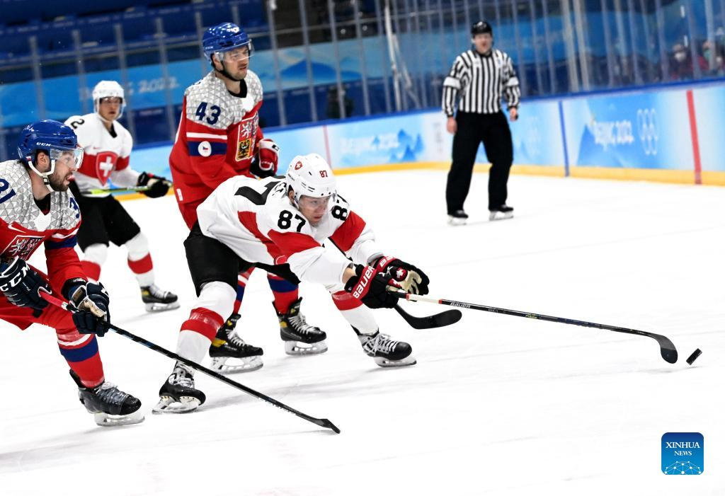 Athletes compete during the ice hockey men's preliminary round Group B match between the Czech Republic and Switzerland at National Indoor Stadium in Beijing, capital of China, Feb. 11, 2022. (Xinhua/Liu Xiao)