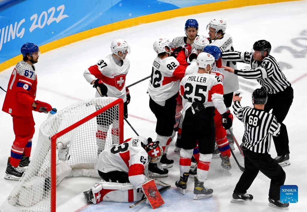 Athletes of the Czech Republic and Switzerland clash during the ice hockey men's preliminary round Group B match between the Czech Republic and Switzerland at National Indoor Stadium in Beijing, capital of China, Feb. 11, 2022. (Xinhua/Liu Xiao)
