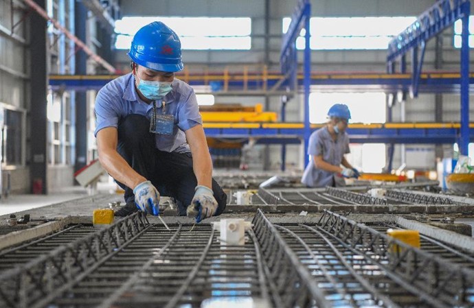 Workers are busy tying steel rods in a workshop of prefabricated building components of Hainan Weite Construction Technology Co., Ltd. based in Haikou city, capital of south China’s Hainan province, Sept. 17, 2021. (Photo by Su Bikun/People’s Daily Online)