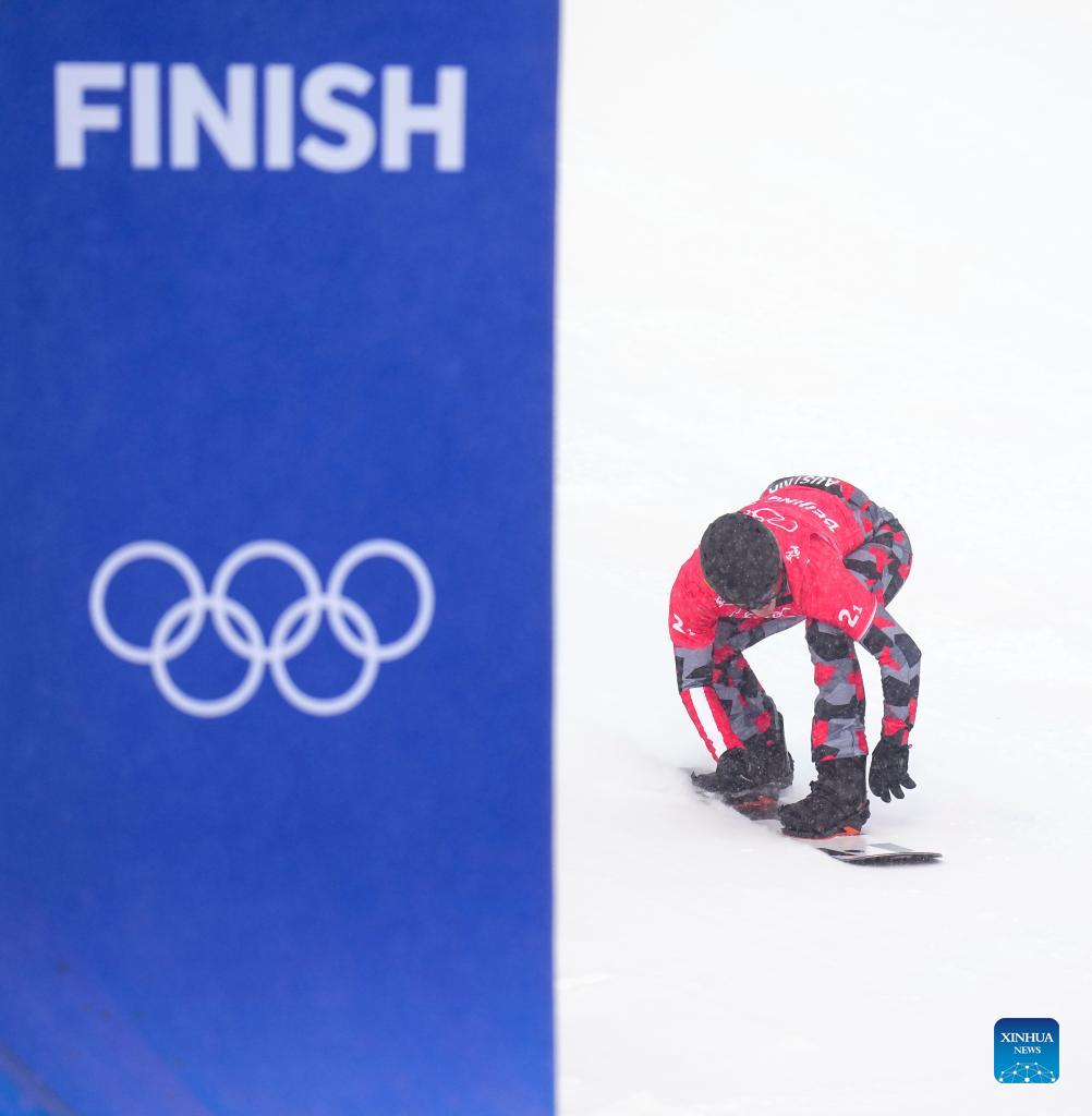Eliot Grondin of Canada competes during the mixed team snowboard cross quaterfinals at Genting Snow Park in Zhangjiakou, north China's Hebei Province, Feb. 12, 2022. (Xinhua/Xu Chang)
