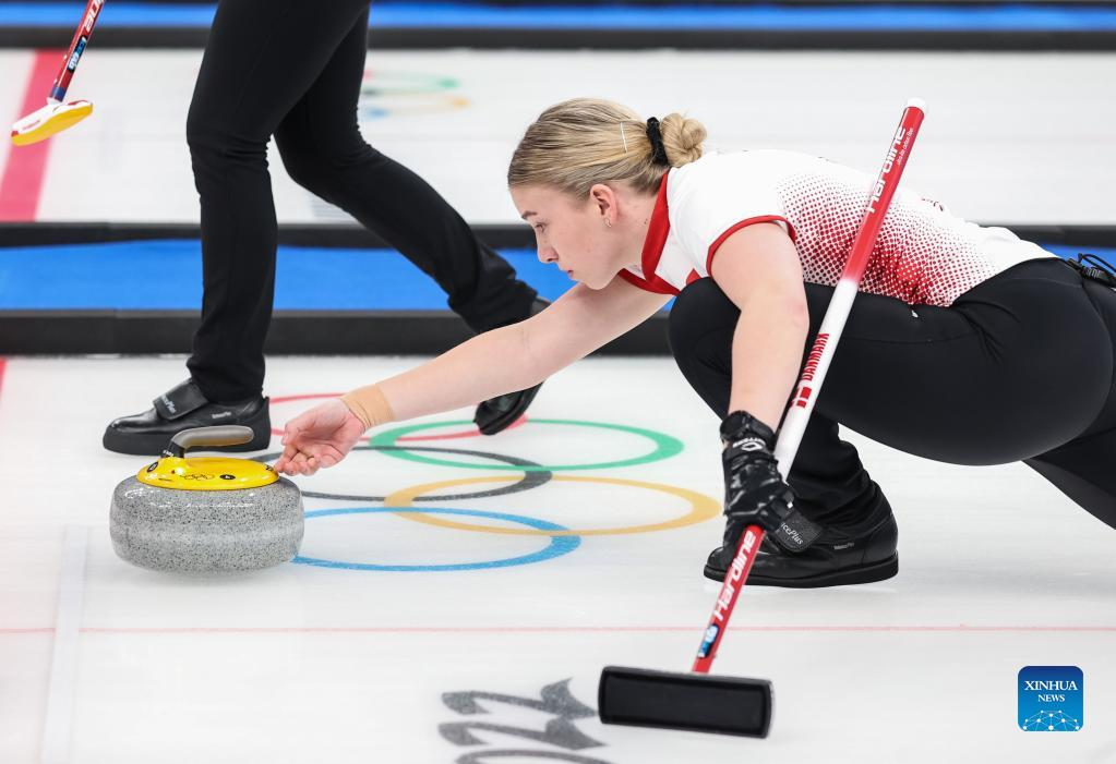Mathilde Halse of Denmark competes during curling women's robin session 4 of Beijing 2022 Winter Olympics between Japan and Denmark at National Aquatics Centre in Beijing, capital of China, Feb. 12, 2022. (Xinhua/Yang Lei)