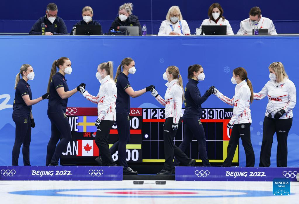 Athletes of Sweden and Canada greet each other during curling women's robin session 4 of Beijing 2022 Winter Olympics between Sweden and Canada at National Aquatics Centre in Beijing, capital of China, Feb. 12, 2022. (Xinhua/Wang Jingqiang)