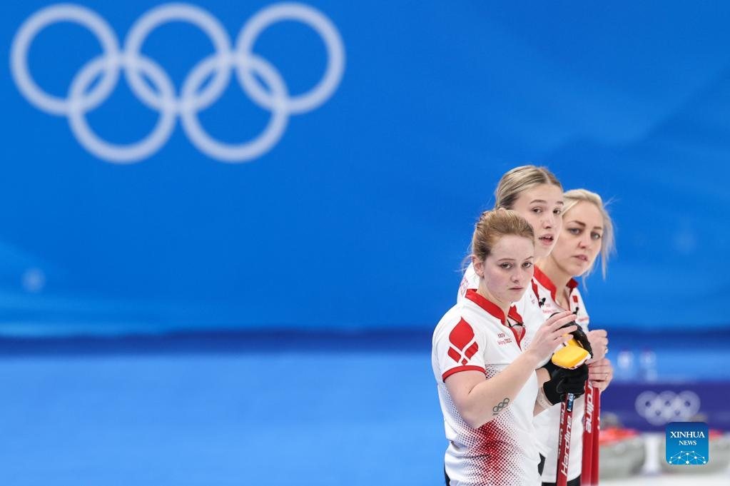 Canada's Kaitlyn Lawes, Dawn McEwen and Jocelyn Peterman (from R to L) compete during curling women's robin session 4 of Beijing 2022 Winter Olympics between Sweden and Canada at National Aquatics Centre in Beijing, capital of China, Feb. 12, 2022. (Xinhua/Wang Jingqiang)