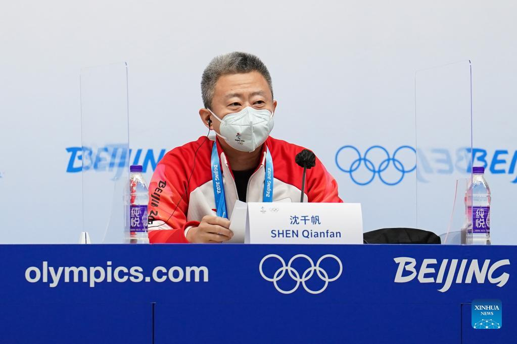 Shen Qianfan, director-general of Village Planning and Operation Department of the Beijing Organizing Committee for the 2022 Olympic and Paralympic Winter Games (BOCOG) speaks during a regular news conference of the BOCOG and IOC in Beijing, capital of China, Feb. 12, 2022. (Xinhua/Ju Huanzong)