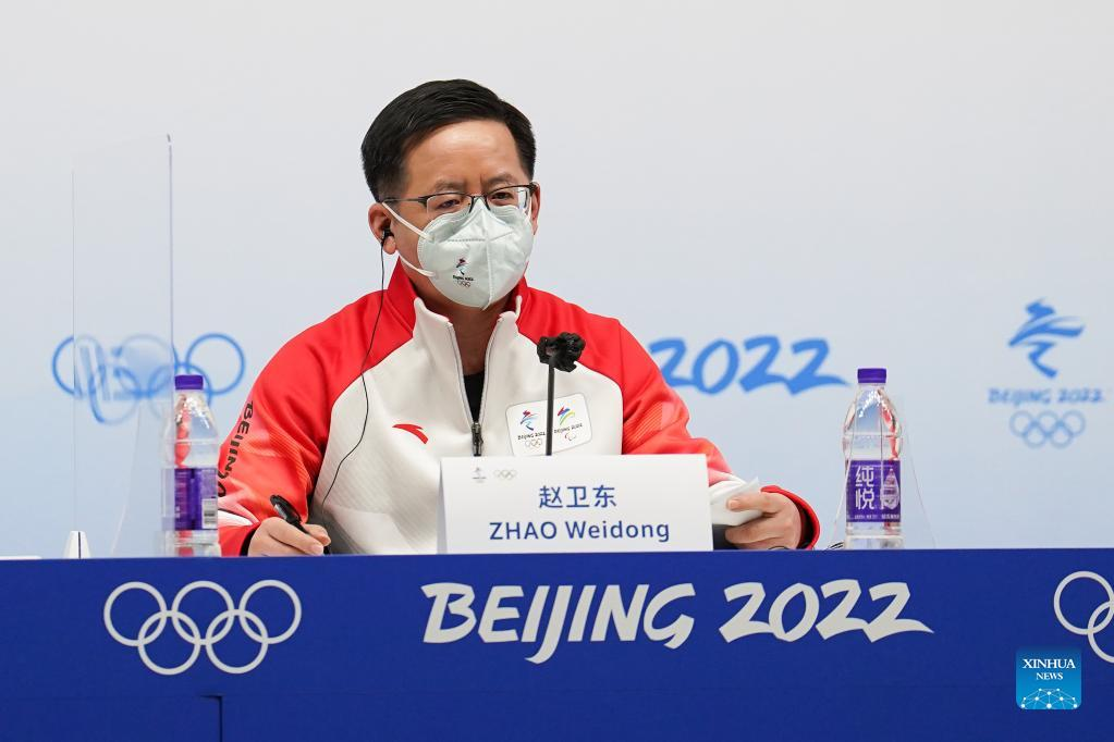 Zhao Weidong, spokesperson of the Beijing Organizing Committee for the 2022 Olympic and Paralympic Winter Games (BOCOG) speaks during a regular news conference of the BOCOG and IOC in Beijing, capital of China, Feb. 12, 2022. (Xinhua/Ju Huanzong)