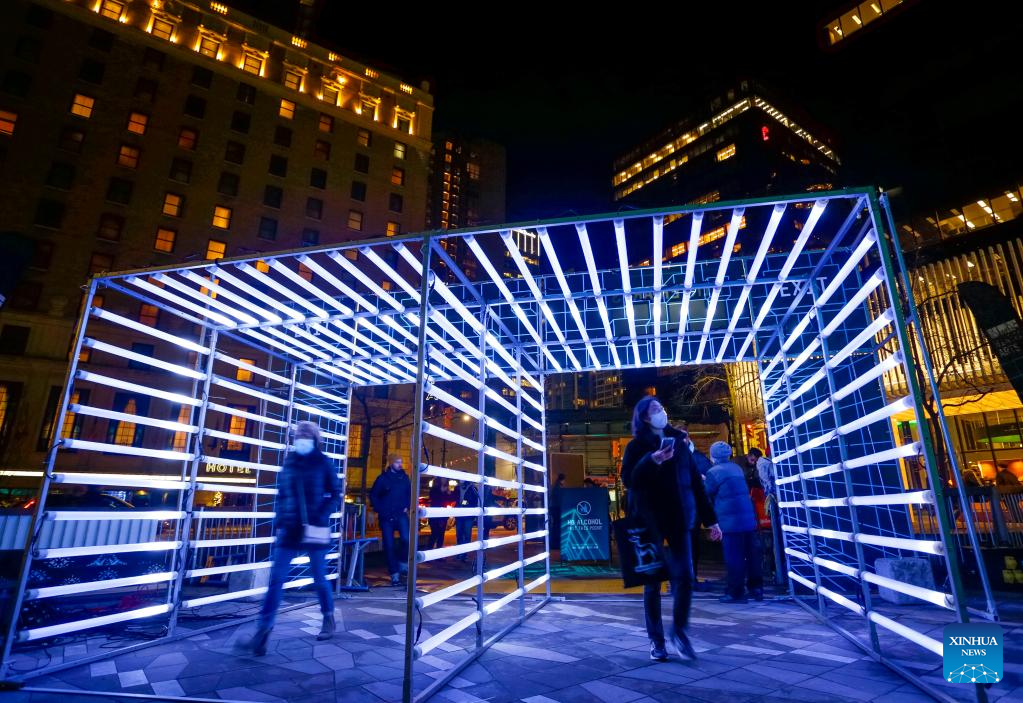 Photo taken on Feb. 11, 2022 shows artistic light installations during the outdoor art festival named "Winter Arts" outside Vancouver Art Gallery in Vancouver, Canada. (Photo by Liang Sen/Xinhua)