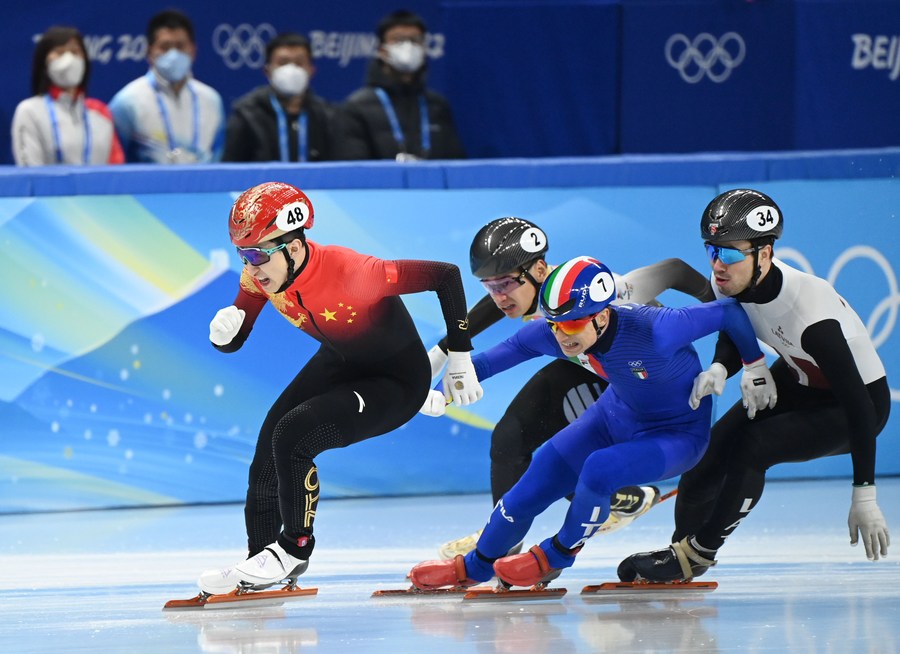 Wu Dajing (1st L) of China sprints to the finish line during the men's 500m short track speed skating quarterfinal at Capital Indoor Stadium in Beijing, Feb. 13, 2022. (Xinhua/Xiong Qi)