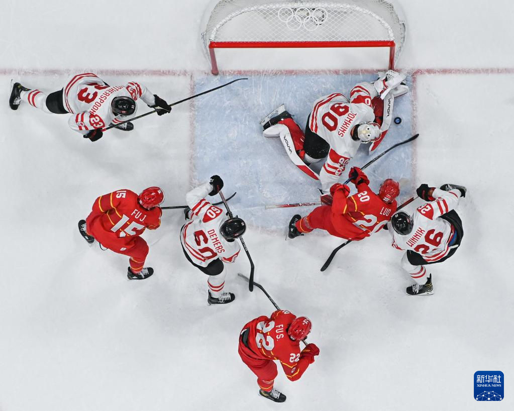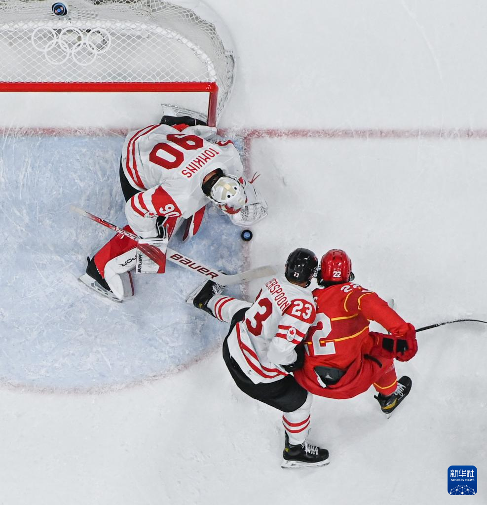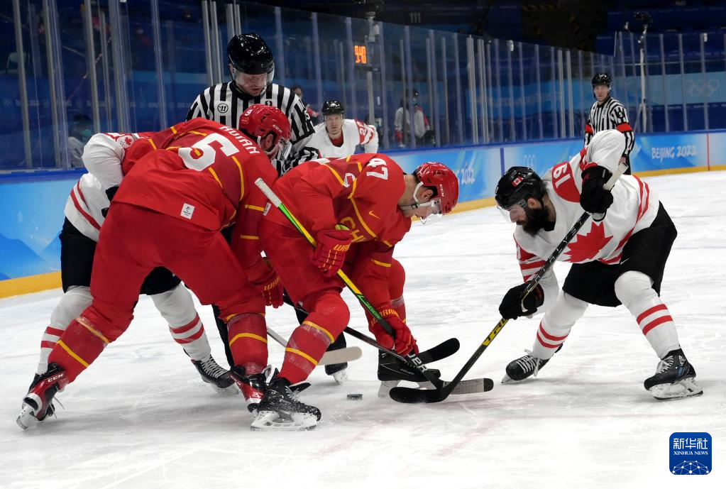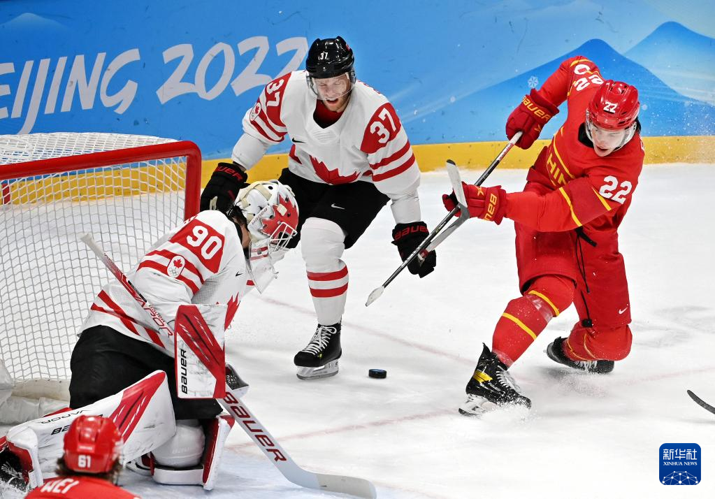 Athletes vie for the puck during the ice hockey men's preliminary round Group A match between China and Canada at National Indoor Stadium in Beijing, capital of China, Feb. 13, 2022. (Xinhua/Li Ziheng)